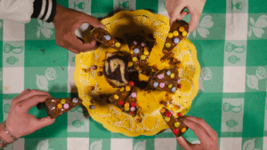 Uma simples taça de mistura torna-se o palco de uma receita mágica, num mundo fantasioso onde os ingredientes são sentimentos e memórias. Mãos brincalhonas transformam ovos em pompons, cores rodopiam a sair de canecas e flores fazem chover corações — um bolo único começa a ganhar forma. Palavras de gratidão caem suavemente na taça e, com um último aceno de varinha mágica, um arco-íris assinala a conclusão do bolo. As fatias são partilhadas e ficam apenas as migalhas — uma celebração da criatividade, da memória e da alegria.